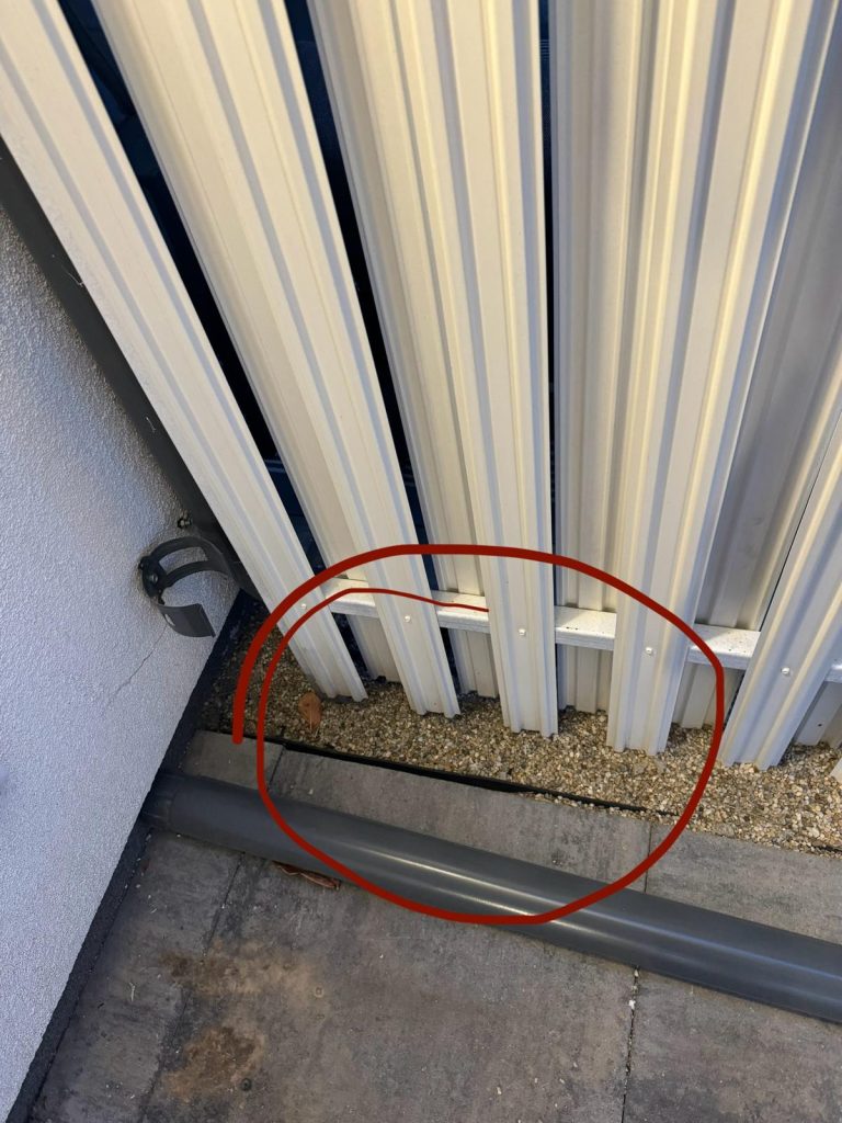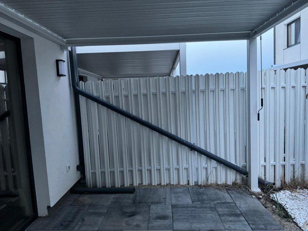 In partea dinspre terasa a caselor insiruite exista cate o teava de pluviala care deverseaza apa chiar sub casa.