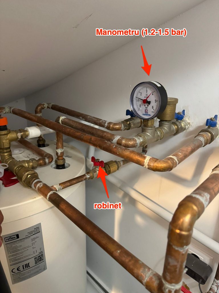 Cum robinetul ce permite alimentarea cu apa a circuitului inchis de incalzire se afla tot sub scara, e foarte comod sa monitorizati in timp real presiunea pe manometru cand efectuati umplerea.