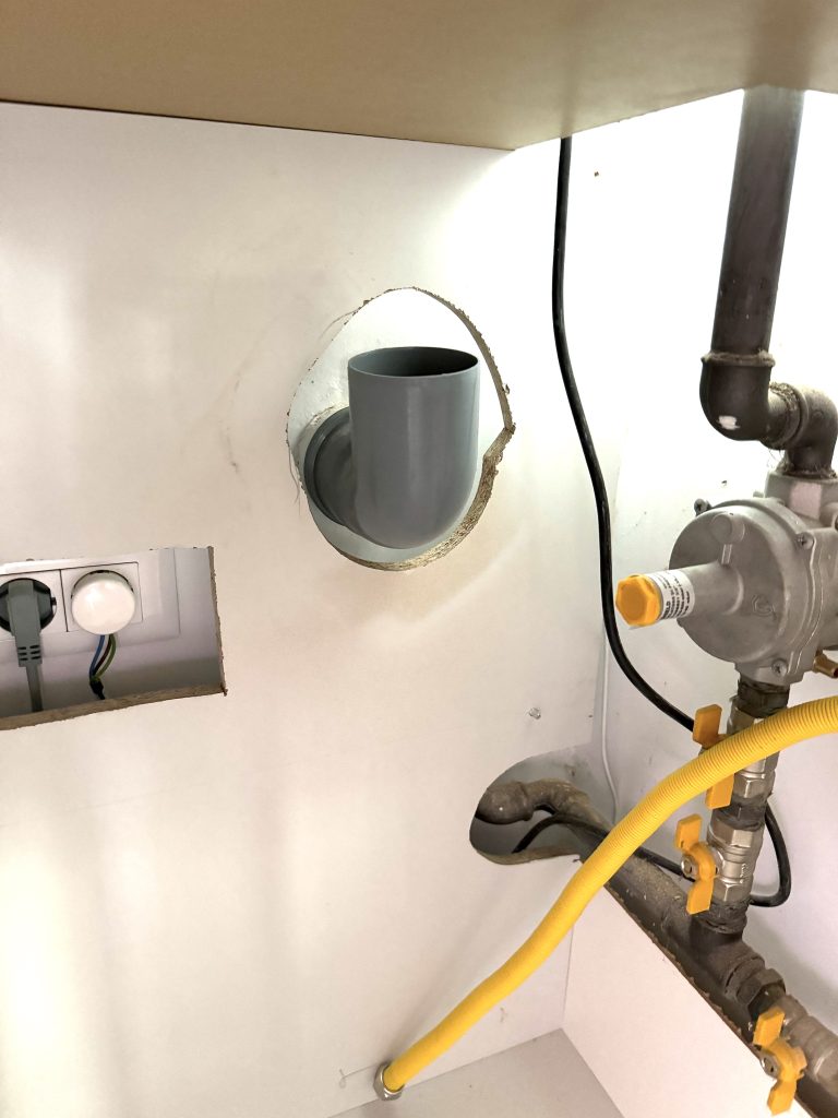 Pentru grila mica, la interior, este recomandat sa montati un cot PVC de 87 de grade, 75mm diametru (se gaseste la Dedeman).